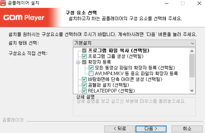 구성 요소를 선택해줘야 합니다. 어떻게 할지 모르겠다면 , 가장 기본값으로 그대로 두고 다음>을 눌러 주세요. 기본값이 가장 간편하고 편합니다.